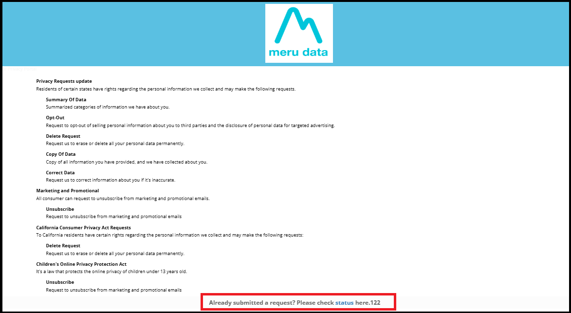 • Summary of Data, OptOut, Delete Request, Copy of Data, and Correct Data.