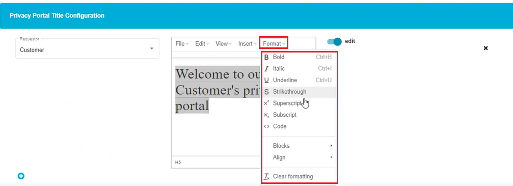 The privacy portal's title (header displayed on the welcome screen) can be configured in this section. For multiple requestors, you can differentiate the title by changing the requestor type.