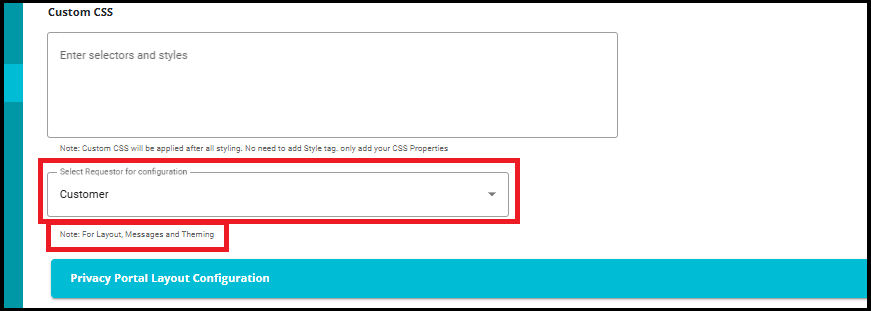 Note: The Requestor field applies only to layout, messaging, and theming configurations in the Privacy Portal. Any additional configurations---such as links, page titles, reCAPTCHA settings, request sequence --- must be configured individually.